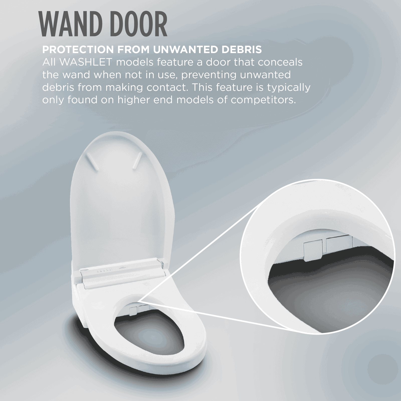 Comfort & convenience | Front & rear wash; 5 spray settings (oscillate/pulsate); heated seat; warm-air dryer; automatic air deodorizer; auto open/close lid; night light |