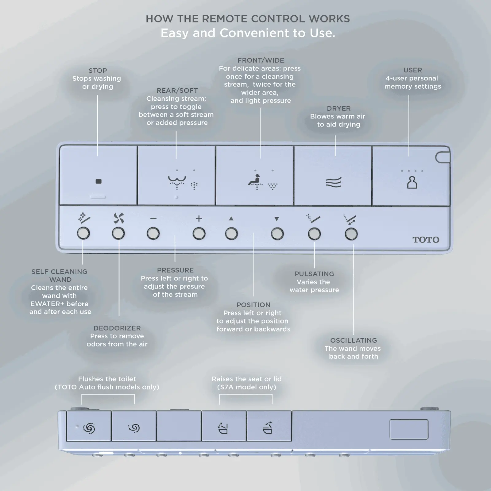 Front & rear warm-water wash with adjustable spray settings including oscillate and pulsate. EWATER+® mists the wand & bowl; PREMIST® pre-wets to reduce adhesion. Heated seat, warm-air dryer and automatic deodorizer complete the comfort.